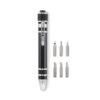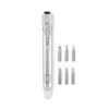 Ferramenta múltipla em alumínio reciclado em forma de caneta com lanterna. Inclui 3 cabeças de chave de fendas tradicional e 3 cabeças de chave de fendas Phillips. 4 pilhas de botão LR41 incluídas. Dimensions : 12,9XØ1,58CM