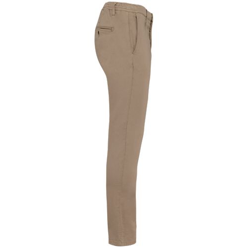 74% algodão biológico 25% algodão tradicional 1% elastano Material stretch. Peça tecida com efeito interior French Terry. Acabamento toque pele de pêssego. Braguilha com carcela com botões metálicos. Dois bolsos laterais. Cintura semielástica nas laterais com presilhas. Dois bolsos traseiros com botões metálicos e cantos reforçados. Dois cordões de ajuste planos no interior. Peça tingida após produção: as cores podem variar de produto para produto. Este produto é susceptível de tingir em contacto com superfícies ou peças de roupa claras. Certificações : OCS Blended / Algodão Biológico EVE Vegan