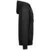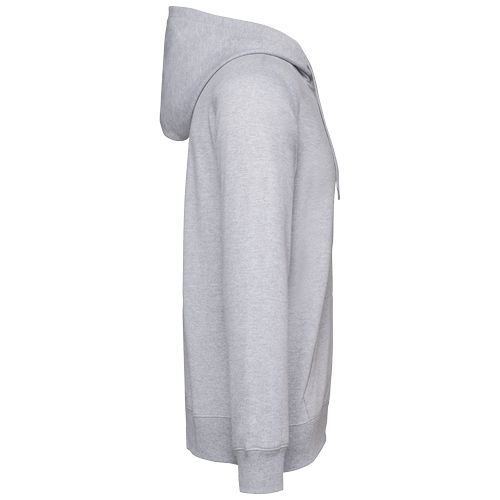 Confecção 50% algodão e 50% poliéster reciclado. Algodão penteado ringspun. Interior cardado suave. 50% algodão ringspun/50% poliéster reciclado pós-consumo. Interior cardado. Corte direito. Corte e cose. Malha rib 2×1 montagem tubular para melhor acabamento do decote, dos punhos e da bainha. Bolso à canguru. Fecho em nylon. Capuz forrado em poliéster / algodão jersey com cordão de ajuste plano. Tapa-costuras em jersey tom sobre tom no interior do decote. Sem etiqueta de marca no decote, apenas com indicação de tamanho para facilitar a personalização.