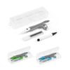 Conjunto escolar de geometria em caixa em PP. Inclui 1 compasso, uma lapiseira e 10 minas de 0’5 mm. 128 x 42 x 20 mmMaterials : -Certificates : Ftalatos, EN71Packing : Polybag, Caixa de oferta – Repacking : Polybag com 10 un., Caixa de ofertaDefault customisation : Estojo geometria – Tampa (Serigrafia – 70 x 30).