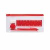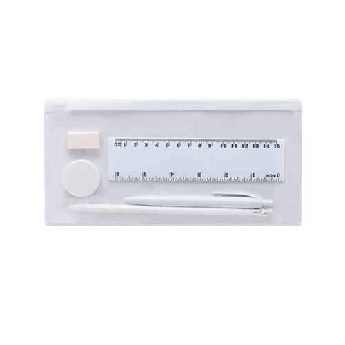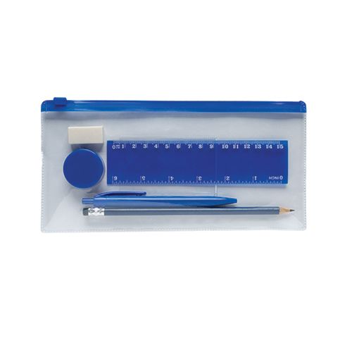 Conjunto escolar, com estojo em PVC. Composto por um estojo em PVC personalizável e por um conjunto de material escolar (1 esferográfica, 1 lápis de carvão, 1 régua de 15cm, 1 afia lápis e 1 borracha).