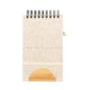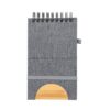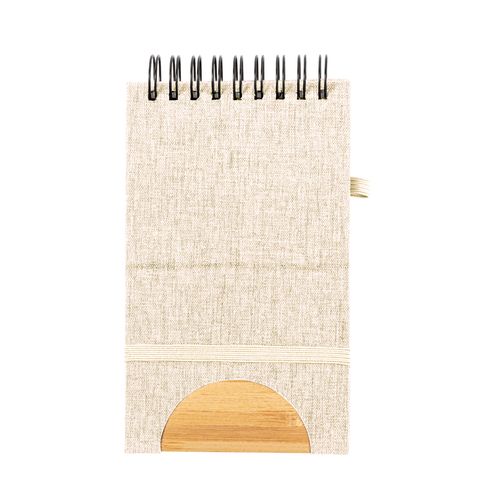 Caderno de argolas com suporte elaborado em RPET 300D e bambu. As suas capas rígidas destacam-se por um versátil suporte integrado para smartphone, fabricado em bambu. Além disso, conta com elástico de fecho e suporte para esferográfica a condizer. Contém 80 folhas interiores lisas e está disponível numa variada gama de cores. Com logotipo RPET na contra capa e apresentado numa bolsa individual reciclada.O material RPET é elaborado a partir de plástico reciclado, para assim promover a reutilização de resíduos plásticos e ajudar na sustentabilidade do planeta.Capa Rígida. 80 FolhasComposition : Poliéster 300D RPET/ Bambu.