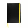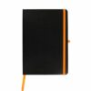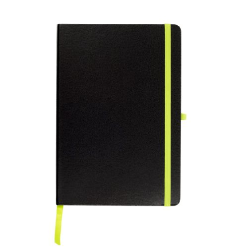 Bloco de notas A5, com capa em cartão e bolsa. O contraste deste bloco chama toda a sua atenção. Com uma capa preta, dá aso ao destaque do elástico, fitilho e porta-canetas colorido. Um bloco com 90 folhas lisas de 70g, ideal para destacar uma personalização colorida.