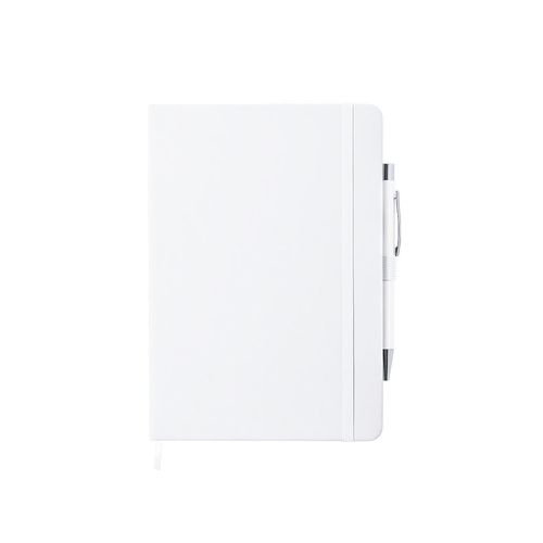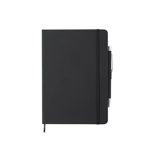 Conjunto de bloco e esferográfica a condizer. Bloco de capas rígidas com toque suave de acabamento em polipele, inclui suporte para a esferográfica, marca-páginas e fecho elástico, com interior de com 100 folhas pautadas. E também, a esferográfica de alumínio com acabamento aborrachado, com carga jumbo. Disponível numa variada gama de cores.Capa Rígida. 100 Folhas. Esferográfica Alumínio Incluída. Carga JumboComposition : PU.