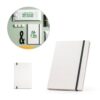 Bloco de notas A5 com capa rígida produzida através de pacotes de leite reciclados, ajudando ao reaproveitamento do cartão e alumínio contido nos pacotes. Contém 160 páginas, em papel 100% reciclado, pautadas cor de marfim, fita separadora e elástico. 145 x 210 mmMaterials : Pacotes de leite reciclados Default customisation : Bloco – Frente (Cunho – 85 x 55).