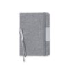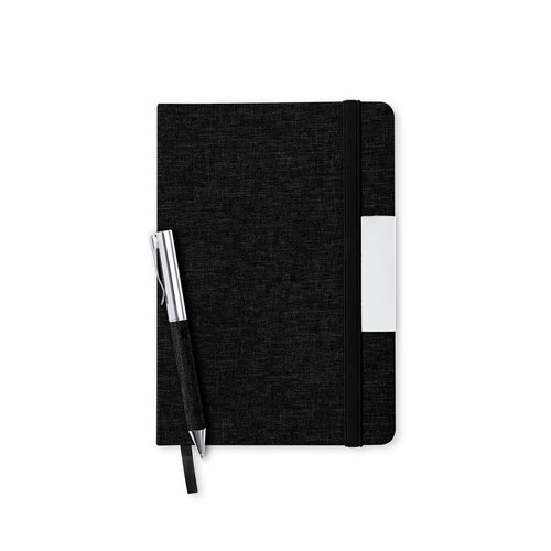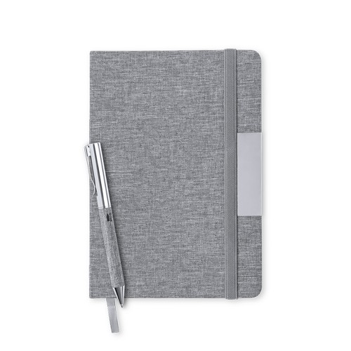 Conjunto de bloco de notas e esferográfica em RPET, elaborado a partir de plástico reciclado para assim fomentar a reutilização de resíduos plásticos e ajudar na sustentabilidade do planeta. Inclui: Bloco de notas de capas rígidas, com detalhe metálico na capa, marca páginas de tecido e fita elástica a condizer. 100 folhas interiores com disposição pautada e distintivo RPET.Esferográfica fabricada em metal cromado e com corpo revestido em poliéster RPET. Elegante clip metálico e acessórios a condizer, de mecanismo giratório e com tinta azul. Com distintivo RPET no corpo.Conjunto apresentado em elegante estojo de design em cor preto, com compartimento independente para bloco de notas e esferográfica.Bloco de Notas Capa Rígida. 100 Folhas. Esferográfica IncluídaComposition : Poliéster 300D RPET/ Metal.