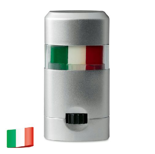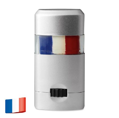 Pintura corporal apresentada em stick prateado e transparente, com várias combinações de cores/ bandeiras.