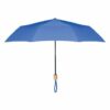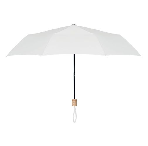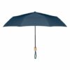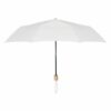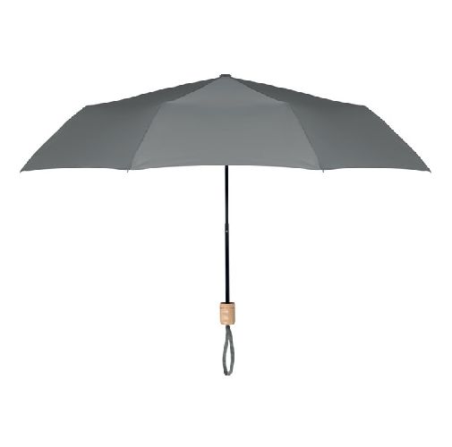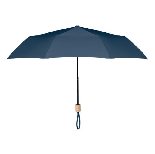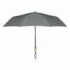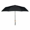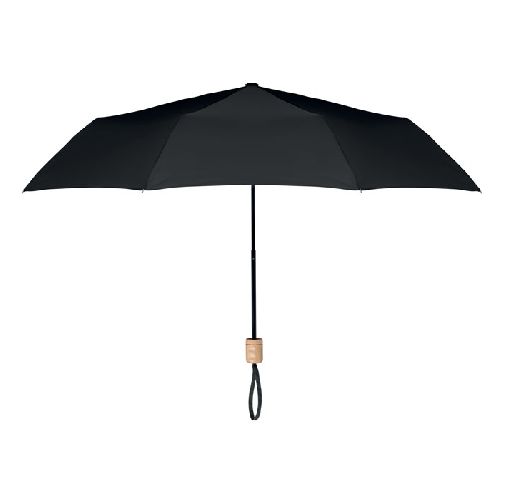 Guarda-chuva de 21”, dobrável em 3 secções, pongee 190T RPET. Estrutura e varetas metal galvanizado preto, pega madeira. Abertura e fecho manual. Funda de pongee.