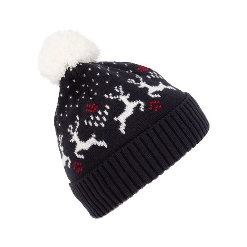 Acrílico e poliéster para excelente conforto e calor. Motivos de fantasia de renas. 100% acrílico. Borda 100% poliéster. Gorro com motivo renas.