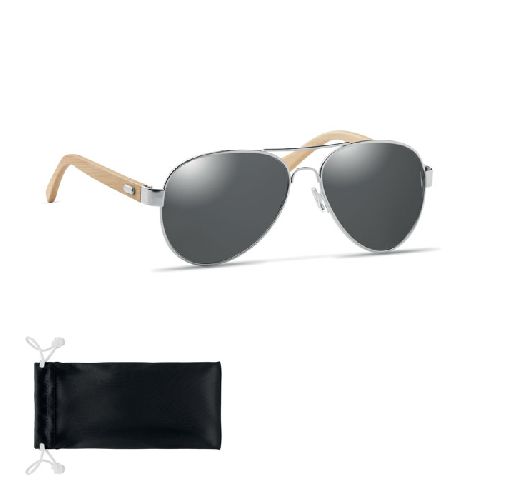 Óculos de sol com braços de bambu e lentes espelhadas coloridas em bolsa de microfibra. Protecção UV400.