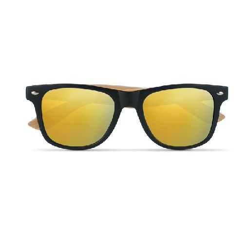 Óculos de sol vintage com hastes em bambu e armação em PC com lentes espelhadas coloridas. Proteção UV400.