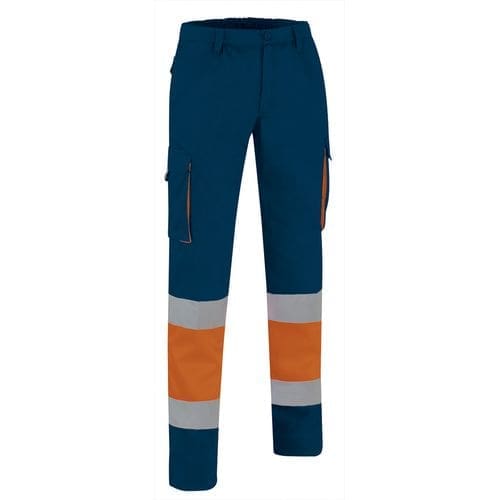 calças de multibolsos de alta visibilidade. confeccionado em tecido de sarja,mescla de algodão com poliéster para durabilidade e resistência, inclui duas fitas retro-reflectoras cosidas nos punhos das pernas para aumentar a visibilidade dos usuários. vestuário certificado como EPI de categoria II de alta visibilidade de acordo com as normas 13688 e 20471, classe 1. cintura com elástico na parte traseira para melhor ajuste, costuras duplas principais e pontos de maior tracção reforçados com laços de segurança para maior durabilidade e resistência. dois bolsos oblíquos nas ancas, dois bolsos laterais com colarinho e dois bolsos traseiros (todos os quatro com fecho de aba em velcro e puxador reflector bicolor para fácil abertura) para manter tudo acessível e disponível. métodos adequados de marcação: estampagem, bordado, transfer, vinil, etc. ideal para uso laboral.Composition : 65% poliéster 35% algodão.
