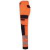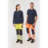 Vestuário de alta visibilidade. Tecido elástico em poliéster reciclado. Reforços elásticos em Cordura® para máxima durabilidade e flexibilidade. 60% poliéster reciclado/36% algodão/4% elastano. Tecido em twill. Tratamento repelente à água. Lavagem a 60°C (25 ciclos). 2 bolsos frontais e 1 bolso pequeno no lado direito. 2 bolsos cargo laterais com fole fechados com aba em contraste e fecho com velcro. 1 bolso plano com encaixe para canetas/ferramentas no bolso cargo do lado esquerdo. 2 bolsos planos traseiros fechados com aba em contraste e fecho com velcro. Presilha em plástico presa na cintura na frente do lado esquerdo. 2 bolsos joelheiras Cordura® em contraste 100% poliamida (joelheiras não incluídas) com velcro e aba no interior para segurar e adaptar a joelheira. 2 faixas segmentadas retrorreflectoras de 8,5 cm e encaixes em contraste na bainha. Cintura elástica nos lados com presilhas para cinto, a qual 1 larga reforçada no centro das costas. Fecho e botão revestido em plástico. Costura tripla entrepernas, lados, à frente e atrás. Bainha ajustável de 5 cm. Certificação em curso: EPI Classe II. Normas NF EN ISO 13688:2013 + NF EN ISO 13688/A1:2021 (Vestuário de protecção – Requisitos gerais), NF EN 14404-1:2024 + NF EN 14404-3:2024: Nível 1U somente combinado com as joelheiras de protecção WKP150 (Equipamento de protecção individual – Protectores de joelhos para trabalho ajoelhado), NF EN ISO 20471:2013 + NF EN ISO 20471/A1:2017: Classe 2 (Vestuário de alta visibilidade – Métodos de ensaio e requisitos), RIS- 3279-TOM Edição 2:2019 somente para a cor Hi Viz Orange/Navy (Norma do sector ferroviário). Etiqueta de marca amovível. Certificações : Polyester recyclé