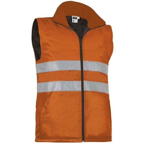 colete acolchoado de alta visibilidade. confeccionado em tecido de tela impermeável no exterior, acolchoado e forro interior liso que proporciona retenção térmica, inclui duas fitas retro-reflectoras cosidas no tronco e nas costas que aumentam a visibilidade dos usuários. vestuário certificado como EPI de categoria II de alta visibilidade de acordo com as normas 13688 e 20471, classe 1. gola alta com forro polar e fecho frontal para maior calor e conforto. dois bolsos oblíquos na cintura com forro polar e um bolso interior, todos com fecho, para manter tudo acessível e disponível. métodos adequados de marcação: estampagem, bordados, transfer, crachás, vinil, etc. ideal para o uso em trabalho.Composition : exterior: 90% poliéster 10% poliuretano – dentro: 100% poliéster.