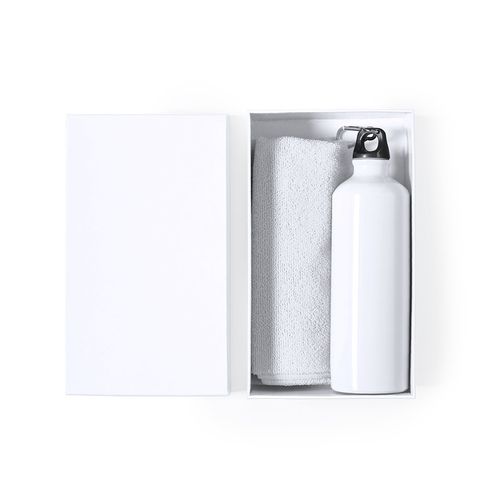 Conjunto de garrafa e toalha a condizer. Inclui:Garrafa de 800 ml de capacidade com corpo em alumínio de acabamento brilho. Com tampa de segurança de rosca e mosquetão metálico de transporte.Toalha absorvente fabricada em microfibra de 160g/m2 e tamanho 40×90 cm.Conjunto disponível numa variada gama de cores e apresentado em caixa de cartão com cores a condizer.Garrafa Alumínio 800 ml. Toalha Absorvente Microfibra 160 g/ m2