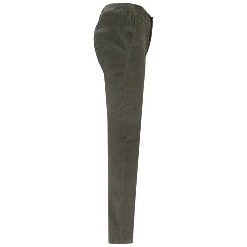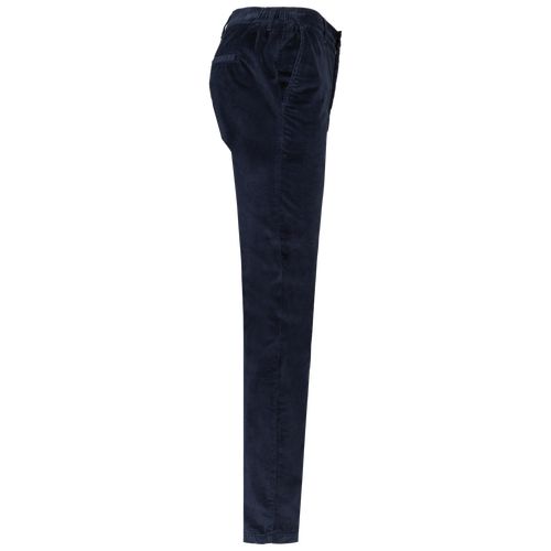 98% algodão biológico/2% elastano reciclado. Tecido. Bombazine. Cintura elástica nas laterais para mais conforto. Braguilha com pesponto, molas de pressão e fecho oculto em metal reciclado. Presilhas para o cinto na frente e atrás. Dois bolsos laterais com pesponto. Dois bolsos traseiros com pesponto. Frente e parte de trás com pesponto duplo e pesponto simples entrepernas para maior reforço. Interior da cintura com acabamento tom sobre tom. Costura simples na bainha. Peça lavada após montagem: as cores podem variar ligeiramente de produto para produto. Certificações : GOTS / Algodão Biológico EVE Vegan
