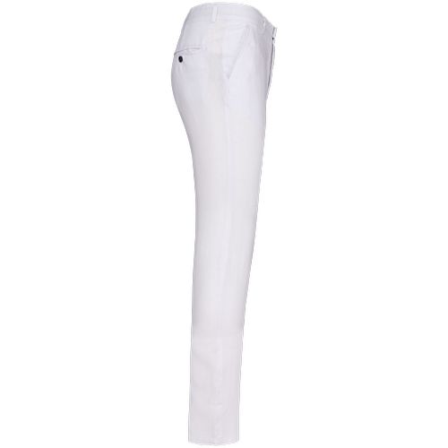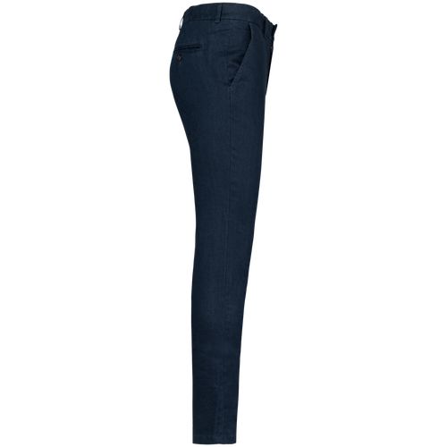 Tecido duradouro, termorregulador e leve. No label para uma personalização sem limites. Tendência e resistente. 100% linho. Tecida. Cintura com presilhas e acabamento interior com contraste de cor azul marinho. Braguilha com botão em plástico reciclado com efeito marmoreado e fecho em metal reciclado. Dois bolsos frontais com pesponto. Dois bolsos traseiros placados com botão em plástico reciclado com efeito marmoreado. Fundo dos bolsos frontais e nas traseiros em chevron tom sobre tom. Pesponto triplo na parte traseira e frontal para maior reforço. Acabamento das pernas com bainha simples. Peça lavada após montagem: as cores podem variar de produto para produto. Certificações : EVE Vegan