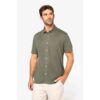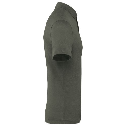 100% linho. Malha. Corte justo. Colarinho com suporte. Encaixe nas costas. Costura com pesponto simples nas mangas e na bainha. Carcela com botões em contraste efeito nacarado em plástico reciclado em todas as cores. Certificações : EVE Vegan