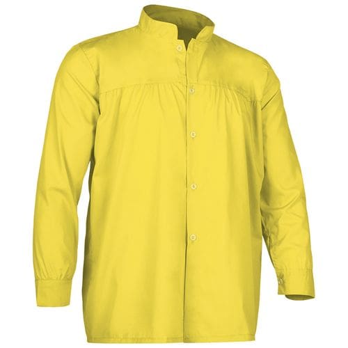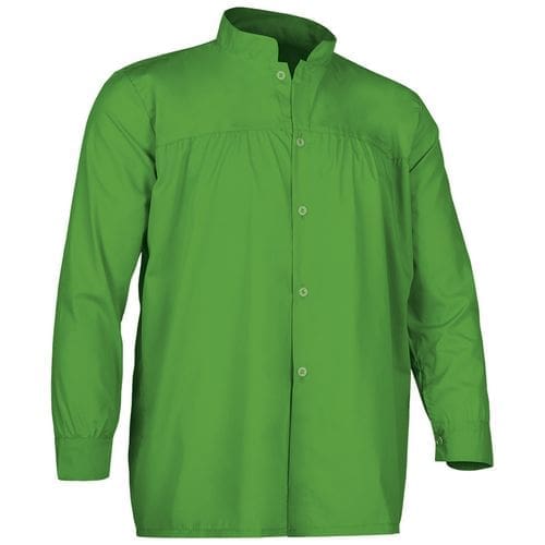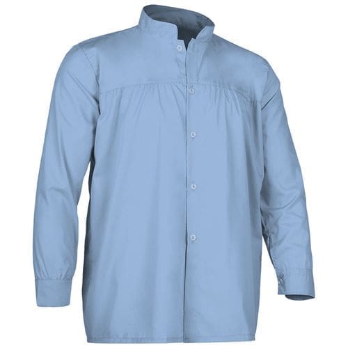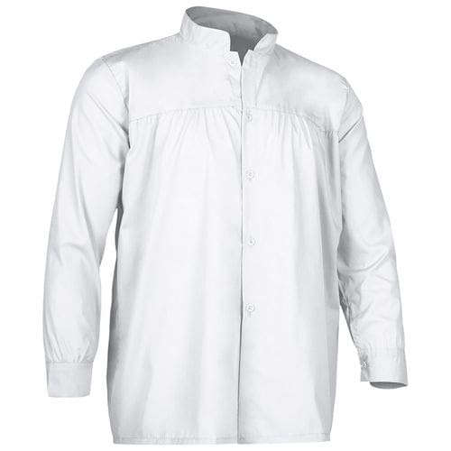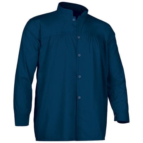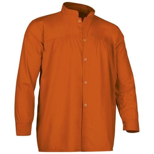 blusão de camisola larga, de manga comprida. confeccionado em tecido de algodão em popelina, mesclado com poliéster resistente e durável. gola redonda elevada e fixação frontal com botões, incluindo espaço na parte inferior para fixação opcional do nó. canesú com franzido em parte superior para maior soltura e conforto. mangas compridas com punhos abotoados para um melhor ajuste. métodos adequados de marcação: bordado, estampagem, vinil, transfer, etc. ideal para festas populares e para vestir associações ou bandas populares.Composition : 65% poliéster 35% algodão.