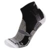 Parte inferior do pé em polipropileno, pé direito e esquerdo. Efeito “strapping” com 3 malhas variáveis. Ponta com anel para maior proteção em descidas. Malha em fibra técnica respirável que optimiza o desempenho dos sapatos com membranas impermeáveis e respiráveis. Muito finas: efeito de segunda pele com zonas de strapping para maior estabilidade. Reforço de pressão na veia plantar para um fornecimento de energia. Parte superior curta. Tecnologia termo-respirável patenteada Climasocks®. Especial trail.