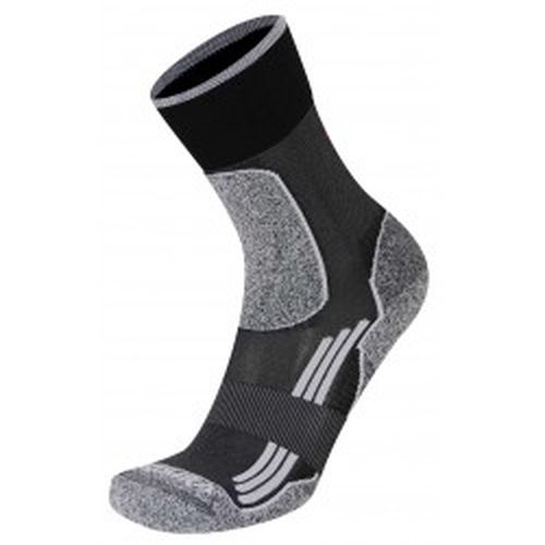 Acabamento duplo em malha anticompressão. Parte inferior do pé respirável com anel fino em poliamida HD. Da parte superior dos dedos dos pés ao tendão de Aquiles. Reforços largos em Cordura® no calcanhar, na ponta e nos pontos de apoio. A fibra Cordura® utilizada na palmilha permite que estas meias tenham uma longevidade excepcional. Foram testadas em condições reais pela ENSA em centenas de quilómetros e apresentam garantia de não rompimento nem no calcanhar nem na ponta até 2000 km ou 2 anos (consoante o que ocorrer primeiro), caso as instruções de lavagem sejam respeitadas. Muito finas – muito leves. Especial caminhada.