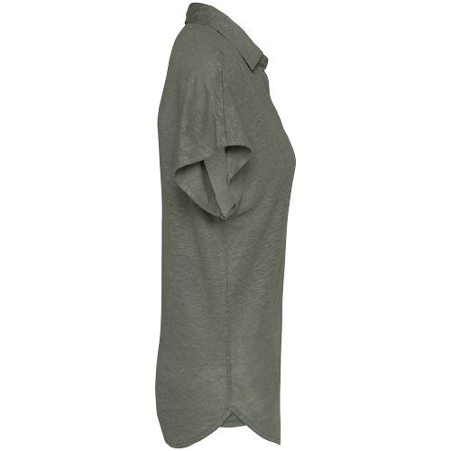 100% linho. Malha. Corte justo. Mangas descaídas. Aberturas laterais com encaixe. Decote V e carcela sem botões no material principal. Pesponto duplo nas mangas e na bainha. Meia-lua nas costas. Certificações : EVE Vegan