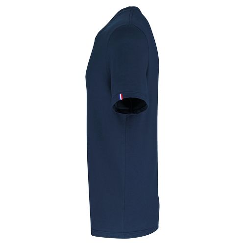 Fabrico 90% francês, certificado «Origine France Garantie». Algodão penteado: durabilidade da peça de vestuário ao longo do tempo. Vestuário de qualidade, ético e que protege o ambiente. 100% algodão orgânico penteado.Etiqueta “Origine France Garantie”. Costuras laterais. Decote redondo em malha rib. Tapa-costuras no colarinho tom sobre tom (prolongamento dos ombros). Etiqueta clip em azul / branco / vermelho na manga esquerda. Acabamento com costura dupla na manga e bainha. Embalagem 100% reciclada. Certificações : OCS 100 / Algodão Biológico