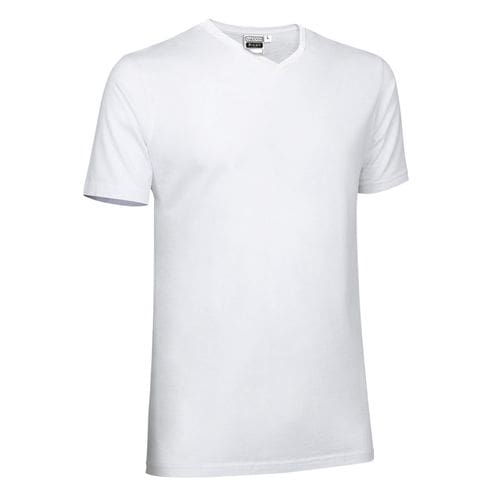 T-shirt com ajuste estreito, mangas curtas e gola em V. confeccionado em tecido de malha lisa 100% algodão ring spun suave e confortável. gola de canalé em forma de V, amplo, confortável e refrescante. costura dupla na gola, bainha e mangas que aumenta a sua resistência. fita de espinha de peixe no interior da gola para um melhor acabamento. métodos adequados de marcação: estampagem, bordado, transfer, vinil, etc. ideal para uso casual.Composition : 100% algodão.