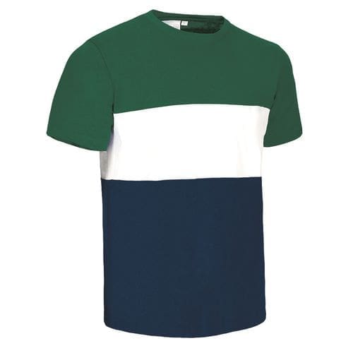 T-shirt de corte regular, mangas curtas, gola redonda e desenho tricolor em ambos os lados. confeccionado em tecido de malha simples 100% algodão ring spun, suave e confortável. feito de peças de cores diferentes entrelaçadas e costuradas duplamente para um melhor acabamento. gola redonda en canalé elástico que encaixa confortavelmente. fita interior de ombro a ombro que reforça a sua estrutura e reduz a deformação. métodos adequados de marcação: estampagem, bordado, transfer, vinil, etc. ideal para uso promocional e casual.Composition : 100% algodão.