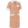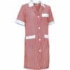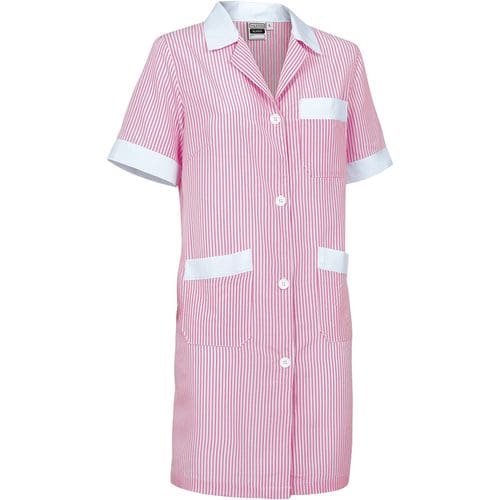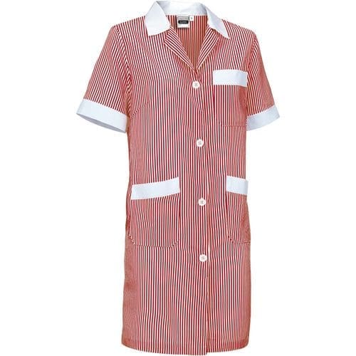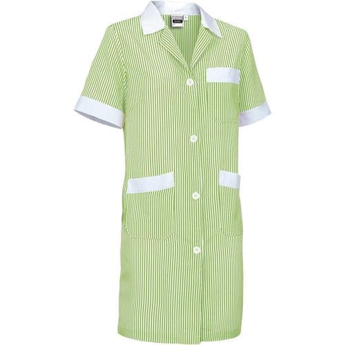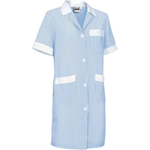bata de trabalho feminino com mangas curtas e ajuste estreito. confeccionado em tecido de malha simples leve com fio tingido e desenho de riscas verticais, resistente e durável. colarinho de camisa com gola ampla em V, confortável e refrescante. fecho central com botões da direita para a esquerda e cintura com fita cosida nas costas para maior conforto. dois bolsos dianteiros e um no peito esquerdo tipo patch para ter tudo acessível e destacar a marcação. métodos adequados de marcação: estampagem, bordado, transfer, vinil, etc. ideal para o trabalho.Composition : 65% poliéster 35% algodão.