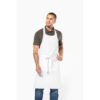 Peça essencial para profissionais: lavagem industrial a 85 °C. Funcional graças ao bolso frontal grande com dois compartimentos. Prático e ajustável. 100% algodão. Lavagem doméstica a 60°C. Lavagem industrial a 85°C em conformidade com as exigências da norma ISO15797. Fivela de ajuste metálica ao nível do pescoço para ajustar o comprimento do avental. Bolso grande à frente com dois compartimentos. Dimensões: A 90 cm – C 76 cm. Bolso: A 20 cm – C 31,5 cm.
