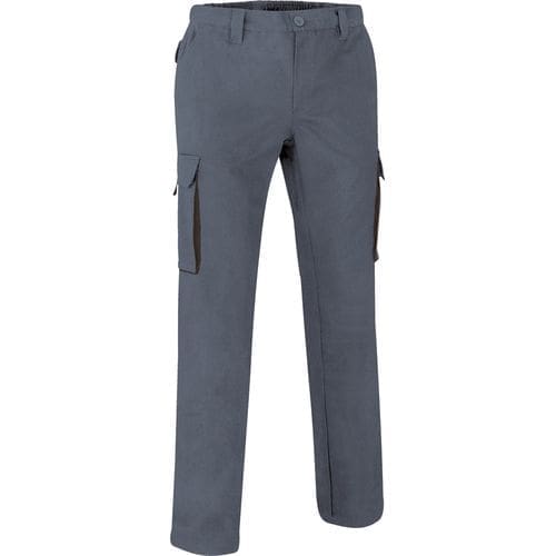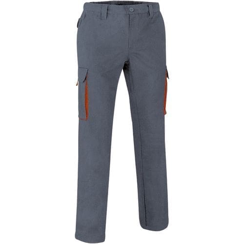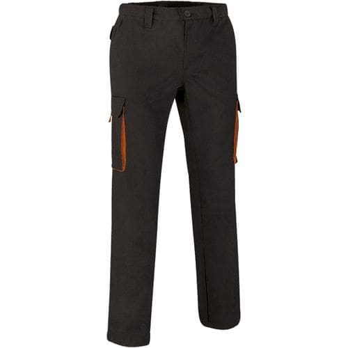 calças de trabalho de multibolsos com desenho de dois tons de acordo com o resto da gama de Thunder (T-shirt, polo, colete, camisola, etc). confeccionado em tecido de sarja de algodão/poliéster para maior durabilidade e resistência. botão e fecho de correr escondido por baixo da aba, cintura com alças de cinto e cintura elástica atrás para maior conforto e melhor ajuste. dois bolsos nas ancas, dois bolsos laterais com fole e dois bolsos atrás (todos os quatro com fecho de velcro e aba de puxar para facilitar a abertura). dupla costura principal e pontos de atração reforçados com laços de segurança para durabilidade e resistência. métodos adequados de marcação: estampagem, bordado, transfer, vinil, etc. ideal para desgaste no trabalho e uniformes.Composition : 65% poliéster 35% algodão.