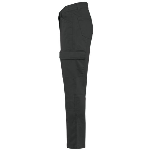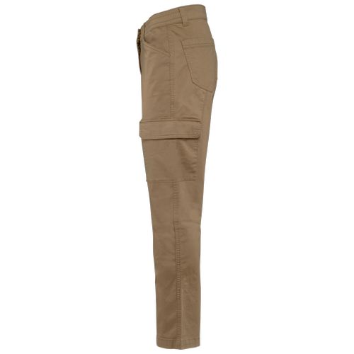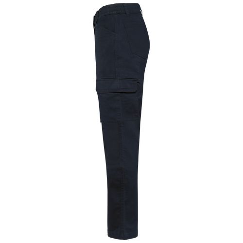 Multibolsos. Cintura semi-elástica para um ajuste confortável. Vasta escolha de tamanhos. 98% algodão/2% elastano. Tecido em twill. Lavagem a 40°C. 2 bolsos à frente. 1 bolso pequeno no lado direito. 1 bolso plano com aba e fecho com velcro no lado esquerdo. 1 bolso duplo aberto para ferramenta (chamado bolso de carpinteiro) atrás no lado direito. 2 bolsos planos traseiros. Cintura elástica nas laterais e presilha para cinto, a qual 1 larga no meio das costas. Fecho com botão em plástico. Pesponto duplo nas laterais, tripla costura entrepernas e gancho (frente e costas). Costura simples na bainha. Etiqueta de marca amovível.
