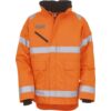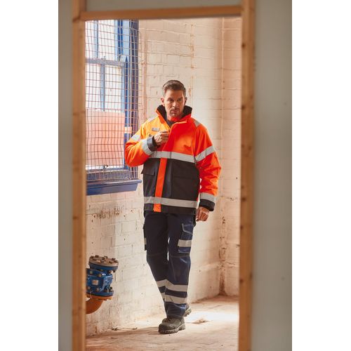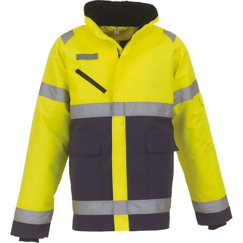 Impermeável e respirável. Gola forrada em veludo com capuz removível integrado. Espaço para personalização do lado esquerdo. 100% poliéster ripstop impermeável e respirável. Forro polar removível. Faixas reflectoras com costura dupla (5 cm de largura) no corpo e nos braços. 2 faixas reflectoras na parte superior dos ombros. Gola polar com capuz amovível. Fecho com cursor duplo resistente com pala com velcro. Bolsos exteriores frontais com acesso duplo pela parte superior e lateral. Bolso para canetas e telemóvel no braço esquerdo. Bolso no peito direito com fecho impermeável e bolso para documento de identificação. Presilha porta-rádio no peito direito. Acesso para personalização do lado esquerdo e na parte inferior. Em conformidade com as normas EN ISO 20471 de categoria 3, EN342:2004 de protecção contra o frio e a norma relativa ao «Vestuário de alta visibilidade» dos caminhos-de-ferro UK GO/RT 3279 Issue 8:2013 (somente na cor Hi Vis Orange).
