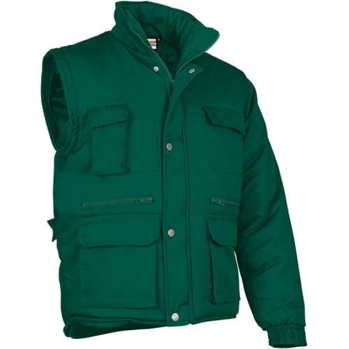 casaco acolchoado de multibolsos com mangas amovíveis que podem ser convertidas num colete. confeccionado em tecido de sarja resistente e durável no exterior, acolchoado e forro liso no interior para uma melhor retenção térmica. casaco facilmente convertível num colete removendo as mangas que são fixadas por fechos de correr. cintura com ajustadores de molas de pressão lateral para um melhor ajuste e abertura da bainha com um dorso mais comprido para proteger a zona lombar. dois bolsos frontais com fixação por zíper, dois bolsos superiores com fecho de aba e velcro, dois bolsos oblíquos, dois à altura intermédia com fecho de correr, um compartimento de caneta e um bolso interior com fecho de velcro, para manter tudo acessível e disponível. inclui fecho interior traseiro para facilitar diferentes tipos de marcação: estampagem, bordado, transfer, crachás, vinil, etc. ideal para o uso de trabalho e uniformes.Composition : exterior: 65% poliéster 35% algodão – dentro: 100% poliéster.
