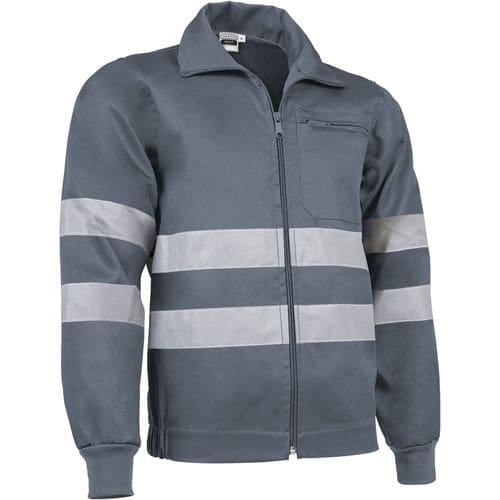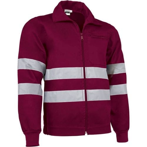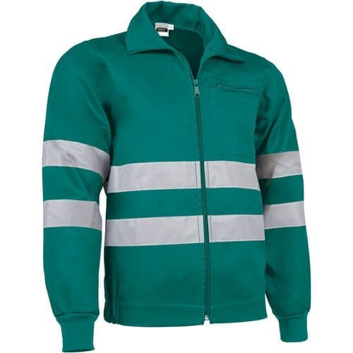 casaco de trabalho com visibilidade aumentada. confeccionado em tecido de sarja mescla de algodão com poliéster para maior durabilidade e resistência, inclui duas fitas retrorreflectoras cosidas no tronco, costas e mangas para aumentar a visibilidade dos usuários. vestuário certificado como EPI de categoria II de visibilidade aumentada de acordo com as normas 13688 e 17353, tipo B3 para visibilidade nocturna. punhos de canalé elástico para um ajuste confortável e cintura com elástico nos lados para melhor ajuste e conforto. bolso esquerdo reforçado com fecho de correr para manter tudo acessível e destacar os métodos de marcação. métodos adequados de marcação: estampagem, bordado, transfer, vinil, etc. ideal para uso em trabalho.Composition : 65% poliéster 35% algodão.