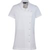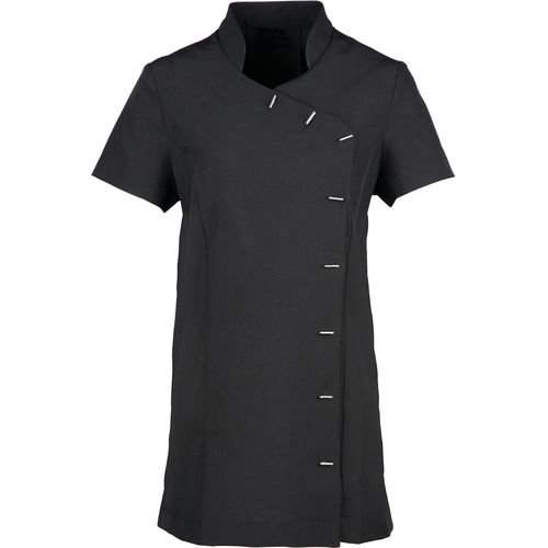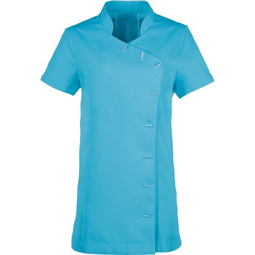 Corte feminino: destaca a silhueta. Manga curta: liberdade de movimentos. Tecido resistente de tratamento fácil. 100% poliéster com efeito stretch. Túnica para estética ou spa com gola mao. Manga curta. Sistema de botões assimétrico na parte frontal com botões metálicos com formato rectangular. Aberturas laterais. Pinça nas costas para maior conforto. Costuras delicadas. Tratamento fácil. Lavável a 40 °C.