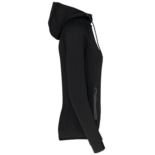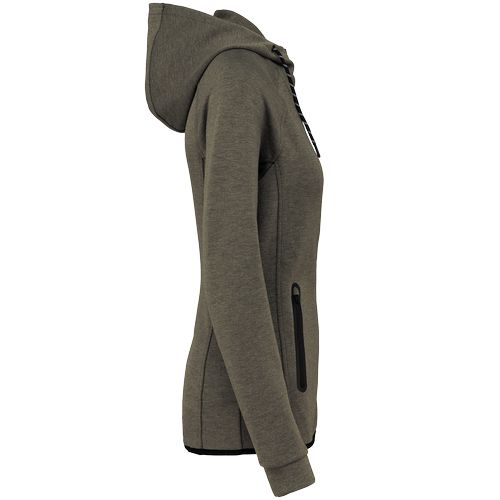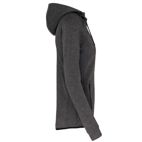 Material muito confortável. Com fecho. 2 bolsos frontais com fecho e acabamento termocolado. 94% poliéster/6% elastano (79% poliéster/15% viscose/6% elastano nas cores mescladas). Material ultraconfortável. Com fecho. 2 bolsos frontais com fecho com acabamento termocolado. Capuz com forro em jersey 65% poliéster/35% viscose com cordão de ajuste bicolor e acabamento em plástico. Mangas ajustáveis com parte elástica em contraste e cós com recobrimento em contraste Black em todas as cores e Dark Grey na Ash Heather (fechos também).