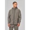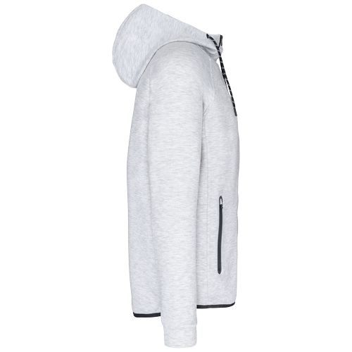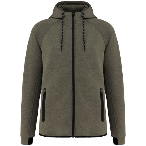 Material muito confortável. Com fecho. 2 bolsos frontais com fecho e acabamento termocolado. 94% poliéster/6% elastano (79% poliéster/15% viscose/6% elastano nas cores mescladas). Material ultraconfortável. Com fecho. 2 bolsos frontais com fecho com acabamento termocolado. Capuz com forro em jersey 65% poliéster/35% viscose com cordão de ajuste bicolor e acabamento em plástico. Mangas ajustáveis com parte elástica em contraste e cós com recobrimento em contraste Black em todas as cores e Dark Grey na Ash Heather (fechos também).