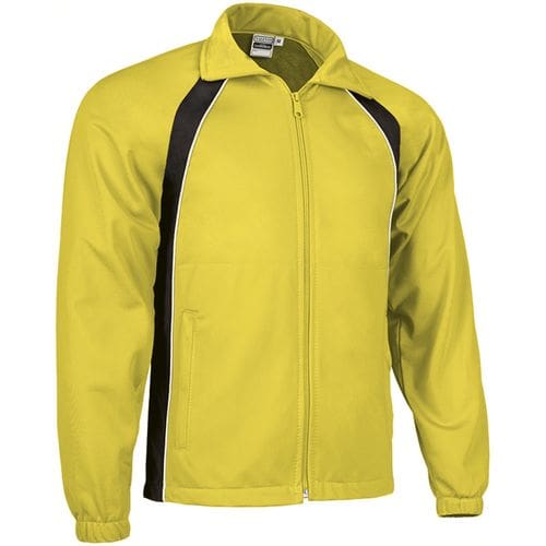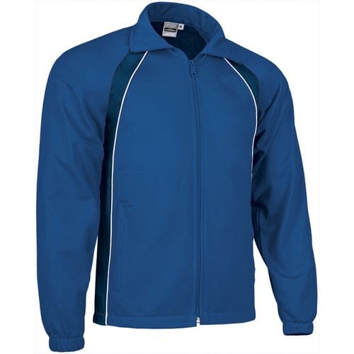 casaco desportivo tipo fato de treino para desporto, com desenho tricolor. confeccionado em tecido de acetato de dual flock com acolchoamento interno que proporciona retenção térmica. mangas ranglan com debrum a contraste e cor diferente nas áreas da frente e de atrás. mangas com punho elástico que se adapta confortavelmente. dois bolsos inclinados na cintura com fecho de correr para manter tudo acessível. métodos adequados de marcação: estampagem, bordado, trenfer, patchs, etc. ideal para grupos desportivos ou escolares, desenhado como um conjunto de calças de Tournament, vendido separadamente.Composition : 100% poliéster.