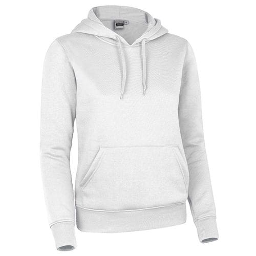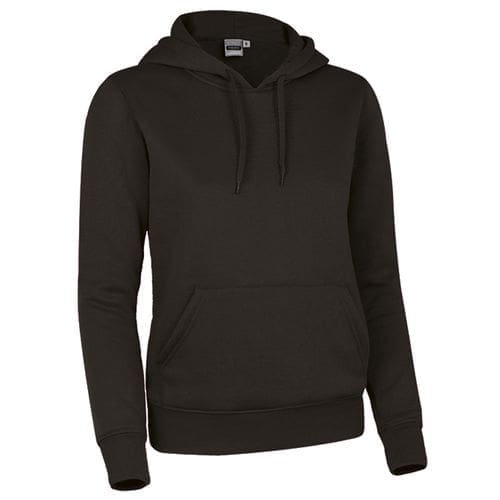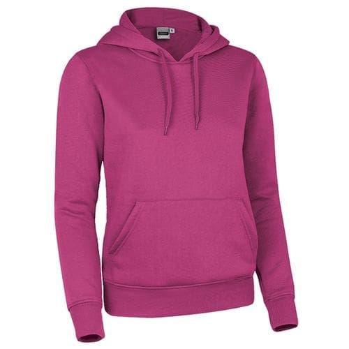sweet-shirt feminina com ajuste estreito, capuz e bolso. confeccionado em tecido de poliéster cardado com toque de algodão e flanelado no interior para melhor retenção térmica e conforto. capuz de dupla camada com cordão ajustável para um melhor ajuste. cintura em canalé elástico e punhos que se adaptam confortavelmente. grande bolso central de canguru para manter tudo acessível e proteger as suas mãos. métodos adequados de marcação: estampagem, bordado, transfer, patchs, etc. ideal para uso promocional, desportivo e casual.Composition : 100% poliéster.