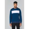 100% poliéster : muito resistente. Tapa-costuras interior no decote. 100% poliéster tricot. Frente com banda em contraste com cerca de 11,50 cm de altura. Decote redondo. Tapa-costuras. Acabamento em malha com elastano no decote na manga e na bainha.