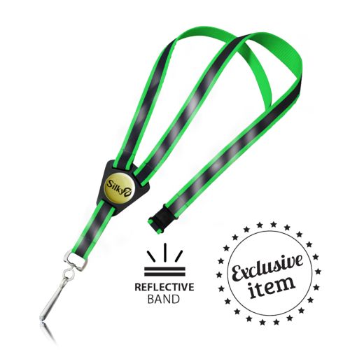 Lanyard em poliéster com acessório em plástico, faixa refletora e mosquetão Tridle